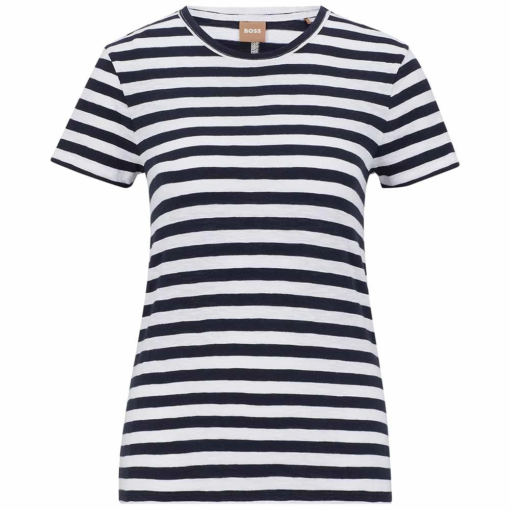 Schmal geschnittenes BOSS T-Shirt aus einem strukturierten Gewebe mit Querstreifen. Für unsere RESPONSIBLE Produkte verwenden wir immer mindestens 60 % nachhaltigere Rohmaterialien. Dieses Produkt wird mit zertifizierter Bio-Baumwolle gefertigt. Beim Bio-Baumwollanbau wird auf den Einsatz von Kunstdünger, Pestiziden und genverändertem Saatgut verzichtet.