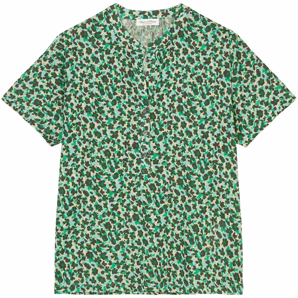 Druckfrisch! Locker geschnittene Jersey-Bluse mit Allover-Print. Aus superleichter und sehr weicher Bio-Baumwoll-Jersey-Qualität mit Tunika-Ausschnitt-Detail, Stehkragen, angeschnittene Ärmeln im Raglan-Stil und einem dezent gerundeten Saumabschluss. Blickfang: die angekräuselte Kragenpartie auf der Rückseite.